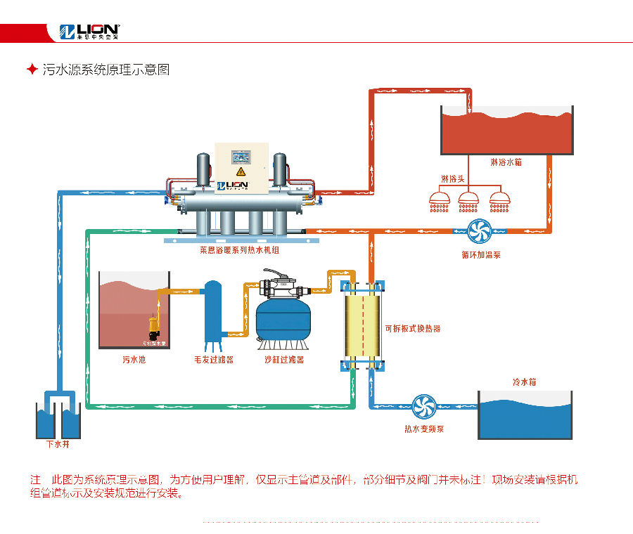 萊恩污水源熱泵余熱回收系統由污水源熱泵機組、污水池、過濾裝置、換熱器、儲熱保溫水箱及連接管路等組成,通過兩次余熱回收程序將洗浴廢水“吃干榨凈”。