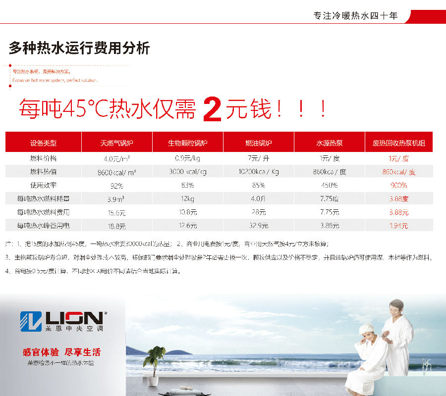 根據實際工況測算,將15℃冷水加熱至45℃(每噸水需30000kcal熱量),采用廢熱回收熱泵機組,峰谷電價平均成本僅3.88元/噸,若充分利用谷電(0.5元/度),成本更可低至1.94元/噸。對比天然氣鍋爐的15.6元/噸、燃油鍋爐的28元/噸,節能率分別高達75%和93%。
